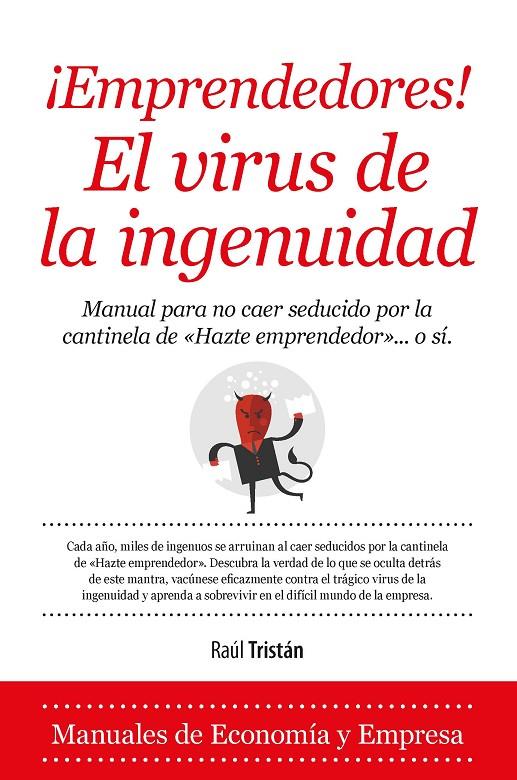 "El virus de la ingenuidad hará que te lances sin paracaídas en pos de tus sueños, o de aquello que crees puede ser tu vía de escape en la apesadumbrante situación de crisis actual". Pues bien, ¡este libro puede salvarte! Su lectura te pondrá, sin duda, de mala leche. No atiende a buenas maneras ni a lo políticamente correcto. Es absolutamente irreverente. Y aunque parezca que ataca de raíz tus ganas de emprender, persigue justamente lo contrario. Tan importante es saber qué debemos hacer, como lo que no debemos hacer. Te ahorrará malos pasos y evitará que caigas en las falacias de los vendedores de humo; te salvará de los típicos malentendidos con socios y acreedores y despejará de pájaros tu cabeza; te librará de ilusiones sin fundamento, te ahorrará trabajo y te llevará directo al grano. Descubrirás al emprendedor que llevas dentro, al que tumba cualquier obstáculo para cumplir su sueño. O puede que no, y entonces agradecerás a este libro el tiempo ganado, el dinero ahorrado, los días de sueño recuperados, los amigos y familiares no perdidos? y otras tantas cosas que nunca te habías planteado.