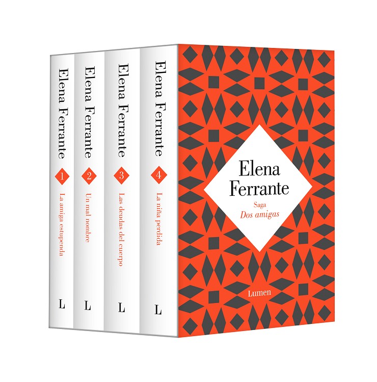 Edición especial en estuche que reúne los cuatro volúmenes de la memorable saga «Dos amigas» de Elena Ferrante: La amiga estupenda, Un mal nombre, Las deudas del cuerpo y La niña perdida.