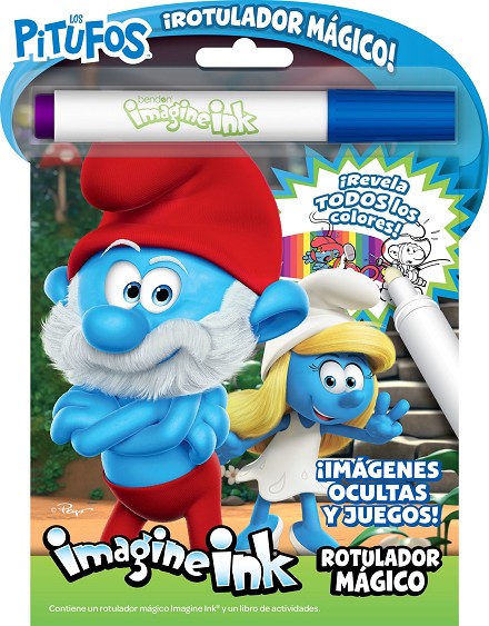 Utiliza el rotulador ma´gico invisible IMAGINE INK® para revelar todos los colores. ¡Descubre ima´genes secretas en cada pa´gina, completa los pasatiempos y colorea a tus personajes favoritos de Los Pitufos!
