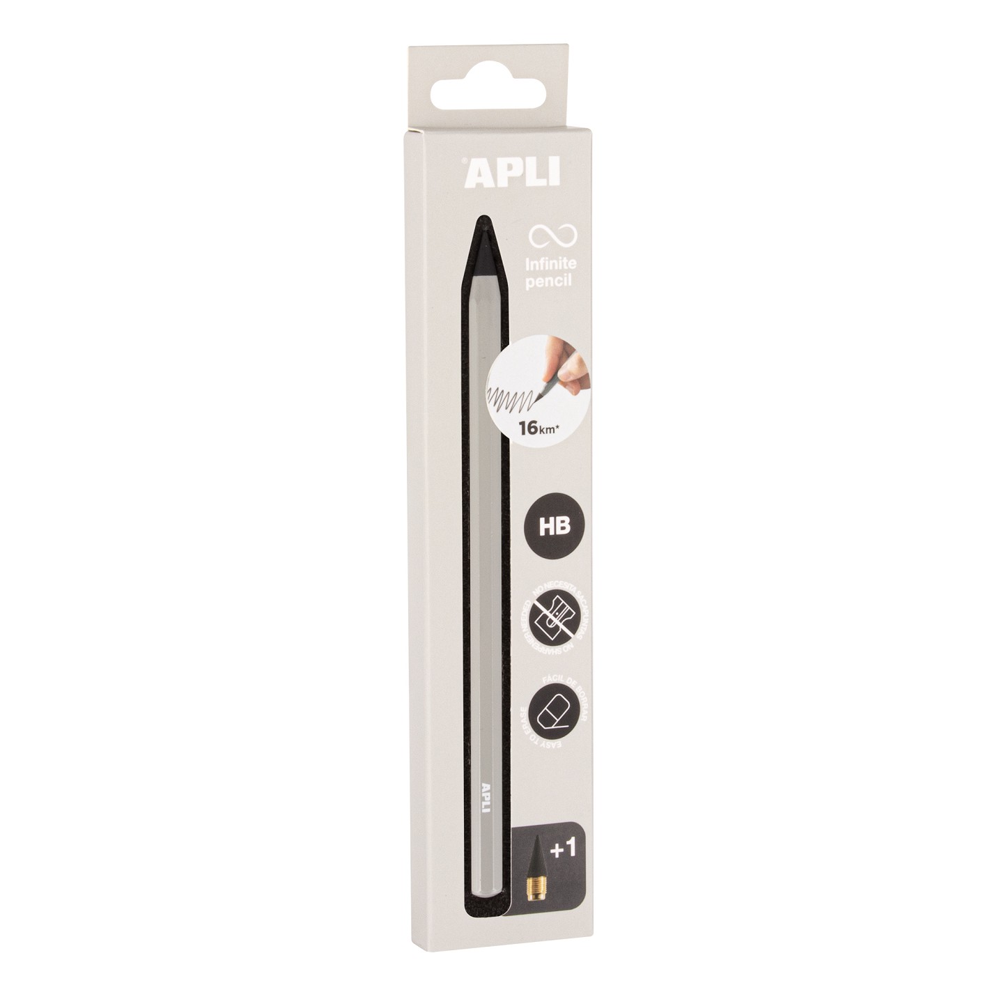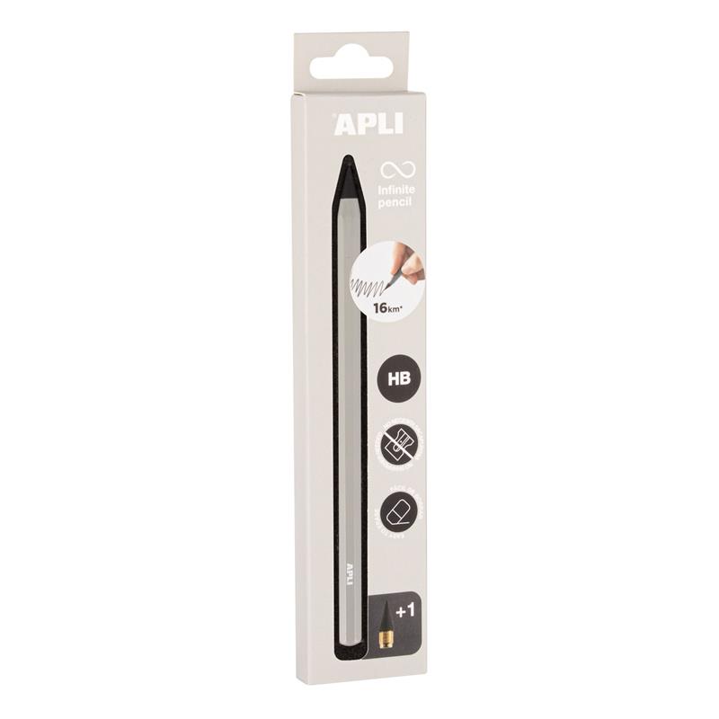 Lápiz infinito de la colección Up North de color gris. Permite escribir sin parar gracias a su mina suavemente abrasiva y duradera. El innovador lápiz Infinito te posibilitará escribir hasta 16 km sin requerir afilado, proporcionándote así una concentración óptima durante tus actividades de escritura y dibujo. La caja incluye 1 lápiz infinito, 1 mina de recambio HB y un tapón translúcido para proteger la punta.